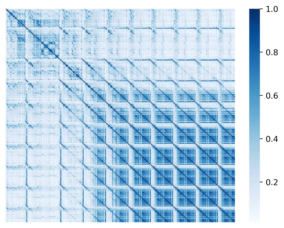 為了更好地理解對比搜索的工作原理,我們對貪心搜索 ( 第 4.1 節 ) 和對比搜索進行了直觀比較。具體來説,我們分別將貪心搜索和對比搜索生成的詞元相似度矩陣可視化。兩個詞元之間的相似性被定義為它們的向量表徵 (即最後一個轉換器層的隱藏狀態) 之間的餘弦相似性。貪心搜索 (上) 和對比搜索 (下) 的結果如下圖所示。
