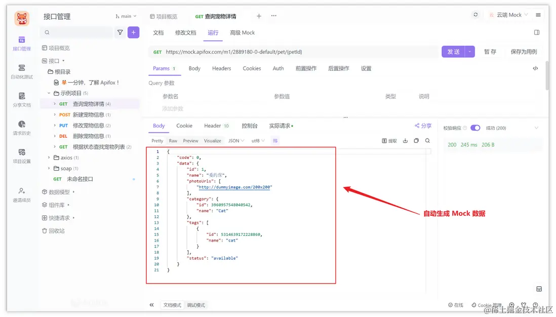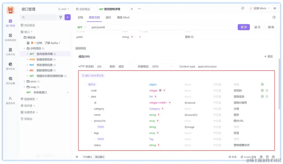 在 Apifox 中使用 Mock 數據更加便捷。您只需在接口中預先定義好返回的數據結構與字段即可。