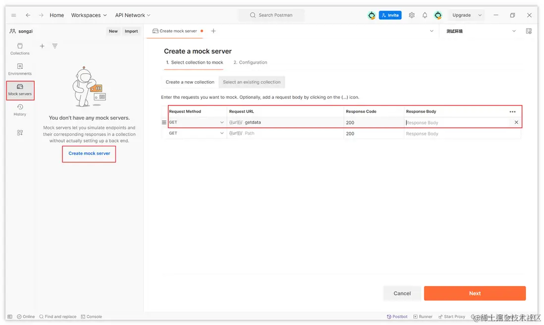 在啓用 Mock Server 功能後,左側菜單欄中會出現新的 Mock Server 選項。點擊此按鈕,你將進入創建 Mock Server 的界面。在這裏,你需要填寫幾項關鍵信息,包括請求的 URL 和所期望的響應細節。填寫完這些基本信息後,點擊“下一步”。