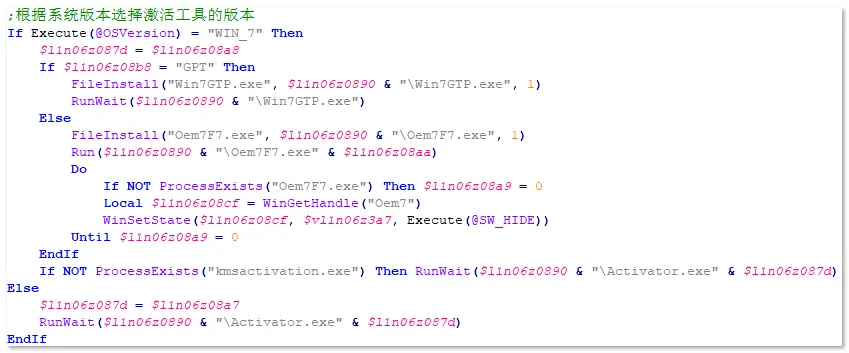 根據系統版本來執行不同的激活工具。相關代碼,如下圖所示: