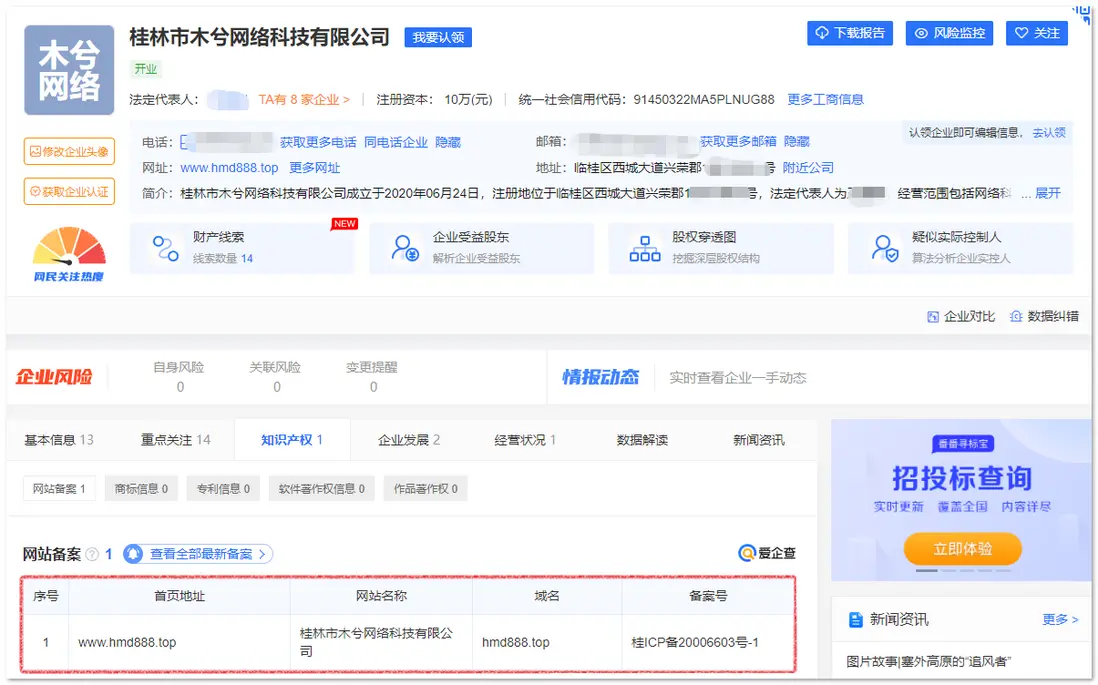 進一步溯源該激活工具的網址hxxp://wd9.hmd888.top,發現該域名屬於“桂林市木兮網絡科技有限公司”,該公司的網站備案信息,如下圖所示: