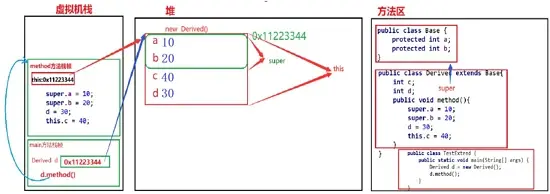 public class Base { int a; int b; public void methodA(){ System.out.println("Base中的methodA()"); } public void methodB(){ System.out.println("Base中的methodB()"); } } class Derived extends Base{ int a; // 與父類中成員變量同名且類型相同 char b; // 與父類中成員變量同名但類型不同 // 與父類中methodA()構成重載 public void methodA(int a) { System.out.println("Derived中的method()方法"); } // 與基類中methodB()構成重寫 public void methodB(){ System.out.println("Derived中的methodB()方法"); } public void methodC(){ // 對於同名的成員變量,直接訪問時,訪問的都是子類的 a = 100; // 等價於: this.a = 100; b = 101; // 等價於: this.b = 101; // 注意:this是當前對象的引用 // 訪問父類的成員變量時,需要藉助super關鍵字 // super是獲取到子類對象中從基類繼承下來的部分 super.a = 200; super.b = 201; // 父類和子類中構成重載的方法,直接可以通過參數列表區分清訪問父類還是子類方法 methodA(); // 沒有傳參,訪問父類中的methodA() methodA(20); // 傳遞int參數,訪問子類中的methodA(int) // 如果在子類中要訪問重寫的基類方法,則需要藉助super關鍵字 methodB(); // 直接訪問,則永遠訪問到的都是子類中的methodA(),基類的無法訪問到 super.methodB(); //訪問基類的methodB() } }2. super的三種用法
