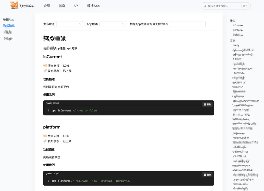 當然,在頁面功能上我們還可以進一步豐富,比如增加實用的篩選功能。比如快速查看特定 App 版本支持的 API、篩選"已上線"、"開發中"或"已廢棄"的接口,這些篩選能力讓文檔不再是靜態的參考手冊,而變成了一個API 探索工具,最終呈現效果如下: