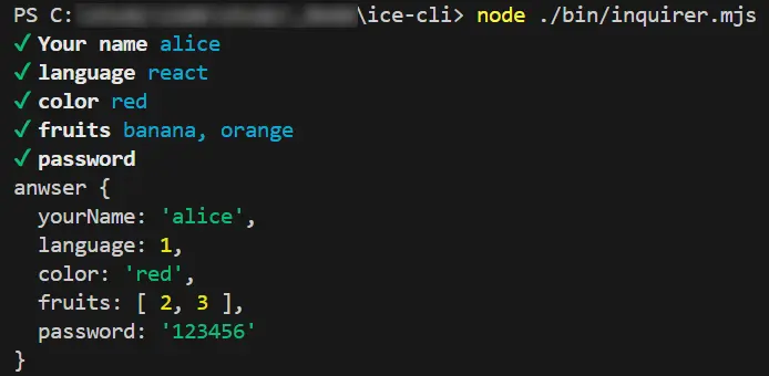 執行上述代碼後,命令行中會依次顯示多個交互問題,最終,所有的用户輸入都會在 then 方法中統一獲取,如下圖所示: