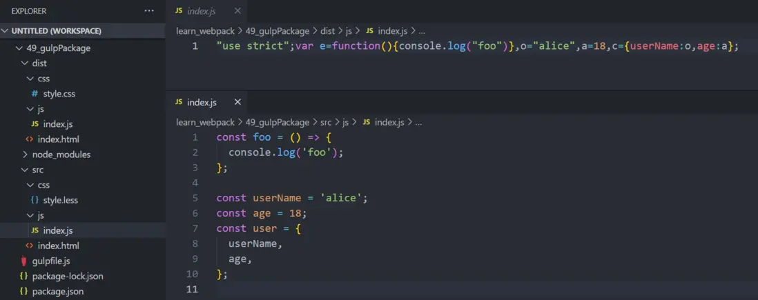gulp-babel 用於轉化代碼等兼容處理,用法和 webpack中babel-loader 相似,gulp-terser 用於壓縮文件,用法和 terser-webpack-plugin 相似。