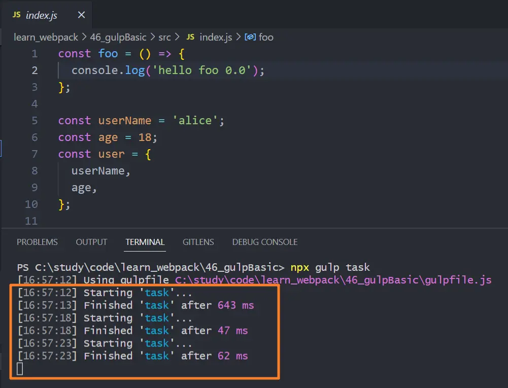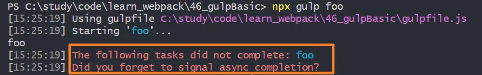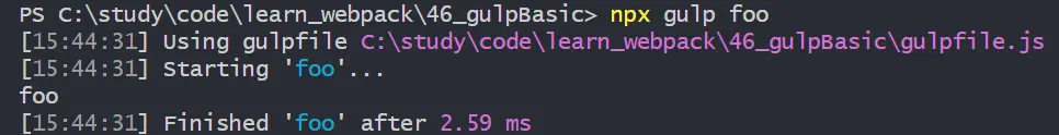 執行 npx gulp foo 命令編譯任務,在 gulp 後面跟上函數名 foo 告知執行的任務名稱