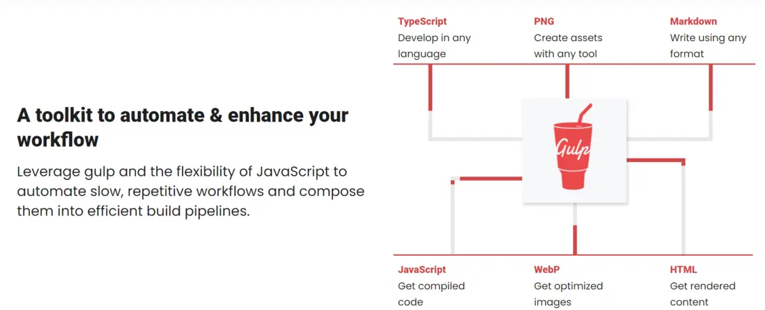 gulp 是一個使用“流”來實現自動化的工具,正如 官方文檔 首頁展示的這副動圖一樣,以“流動”的狀態去處理 TypeScript、PNG、Markdown 資源。