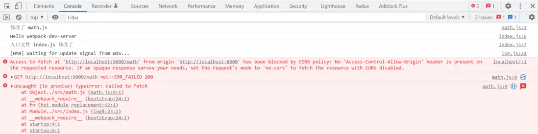 比如本地項目運行在8000端口,訪問接口 http://localhost:9000/math,會報錯跨域