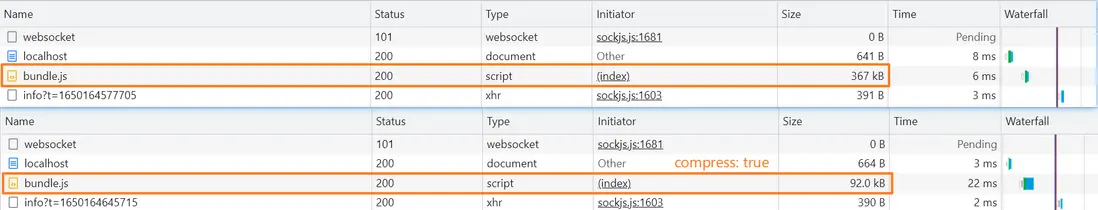 通過 compress: true 來開啓,bundle.js 文件由原來的367kb壓縮到93kb