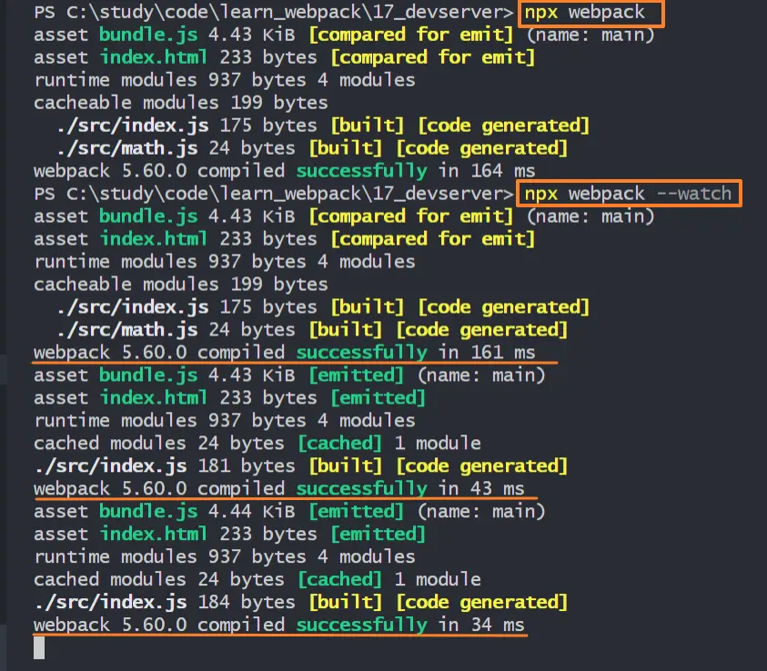 我們通過 webpack 執行命令時,編譯完成之後進程會停止,而 webpack --watch 編譯完成後,不會停止進程,並且當文件內容發生更改時,將重新執行編譯操作。