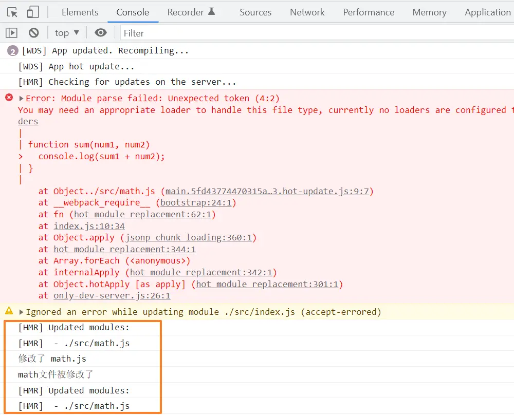 當引入的 math.js 文件被修改時,執行修改的部分,以及修改後的回調函數。