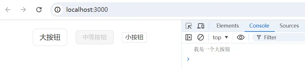 在瀏覽器中可以看到組件效果,以及點擊【大按鈕】會觸發對應的事件