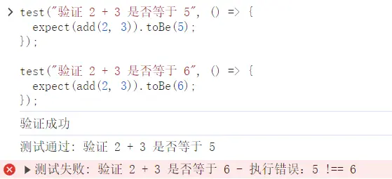 expect(add(2, 3)).toBe(5); // 輸出:"驗證成功"