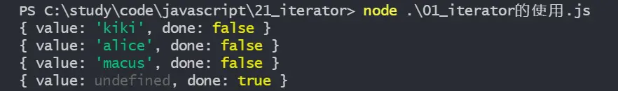 當遍歷完成時, done 為 true,value 值為 undefined。