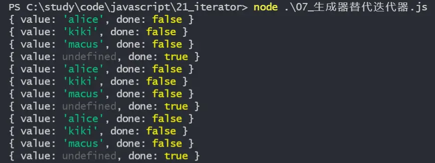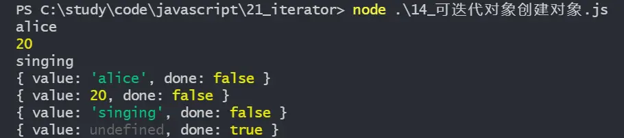 調用next方法時,返回值與迭代器一致,為包含 value 和 done 的對象,此時value為undefine,因為yield後沒有加上返回值