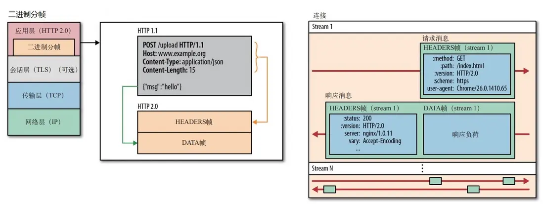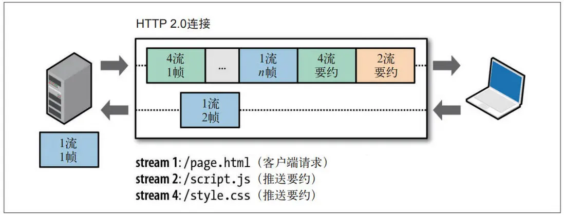 把 HTTP 消息分解為獨立的幀,交錯發送,然後在另一端重新組裝是 HTTP 2.0 重要的一項增強。事實上,這個機制會在整個 Web 技術棧中引發一系列連鎖反應, 從而帶來巨大的性能提升。