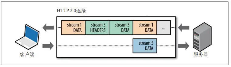圖中包含了同一個連接上多個傳輸中的數據流:客户端正在向服務器傳輸一個 DATA 幀(stream 5),與此同時,服務器正向客户端亂序發送 stream 1 和 stream 3 的一系列幀。此時,一個連接上有 3 個請求 / 響應並行交換。