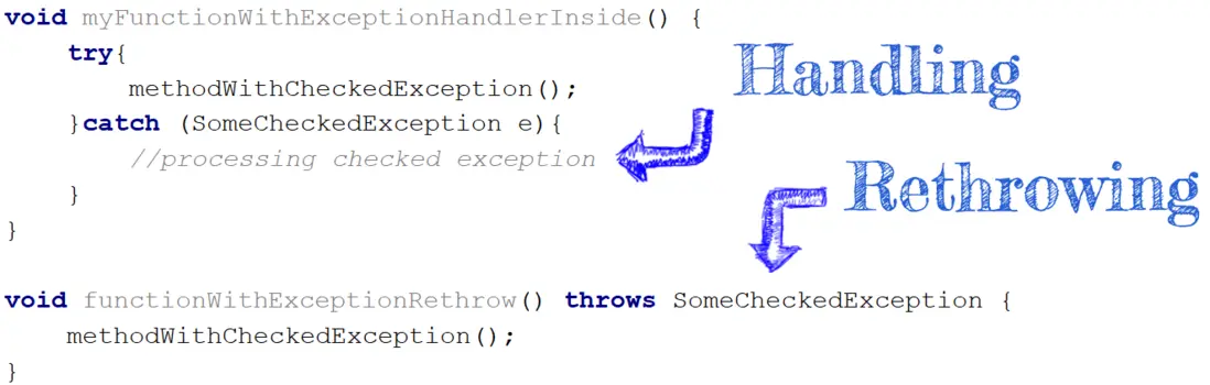 在 Java 中,有兩種類型的異常。已檢異常迫使開發人員創建處理程序異常或重新拋出它們。如果重新拋出已檢查的異常,則 java 函數必須在其簽名中聲明它。未檢異常 unline checked 不需要任何處理。 這樣的設計意味着無法處理未經檢查的異常,並且註定會被拋出到頂級父類。