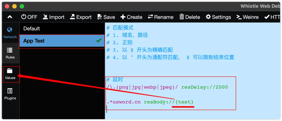 什麼意思呢?創建的每個規則都可以影響到請求,當規則後面打了✅就代表生效中;上方的test表示一個規則值,這個是用户創建的,下個章節我們講