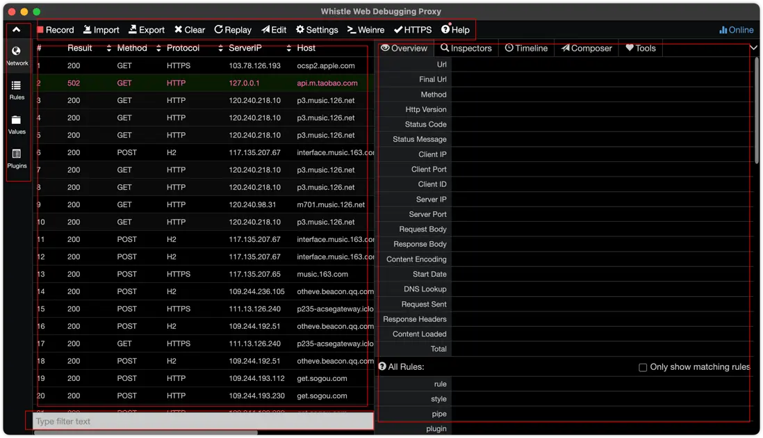 當正在抓包時左上角的Record會顯示紅色,此時whistle會將所有的請求抓取到中間面板列表