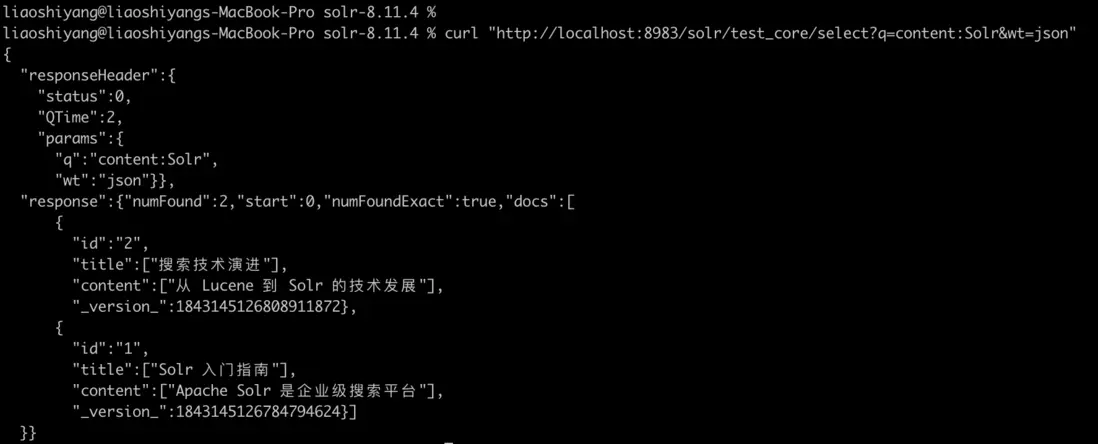 curl "http://localhost:8983/solr/test_core/select?q=content:Solr&wt=json"