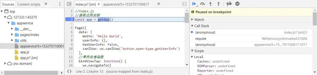 點擊 編譯 按鈕,我們的小程序自動啓動,設置在控制器裏的斷點就自動觸發了。這樣我們就可以通過單步調試的方式來學習微信小程序控制器的調用上下文了。