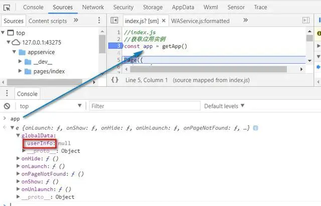 為什麼這個 app 實例如此重要,以至於放到控制器的第一行代碼來創建呢?我們直接在調試器裏輸入 app 然後回車,能看到這個 app 對象裏包含了 globalData 這個屬性和很多有用的方法。