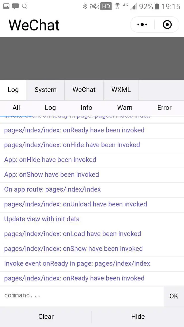 接着整個手機屏幕就被微信小程序的調試器充滿了。這個調試器和電腦上安裝的微信開發者工具相比,僅僅能顯示日誌和執行一些簡單的 JavaScript 操作,但是不能像電腦上那樣,進行 JavaScript 代碼的調試。