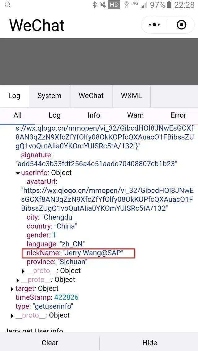 我們可以直接在手機上打開微信小程序的 console 頁面,從而查看當前視圖綁定的數據模型 userInfo 的明細,其中 userInfo.nickName 包含的值如下: