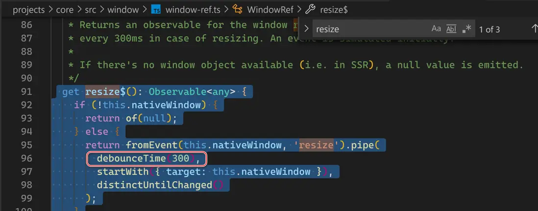 這裏我們使用了 rxJs 的 fromEvent 和 debounce, 將 window 對象產生的 resize 事件,做了一個 300 毫秒的限流,意思是當 resize 事件觸發後,如果300毫秒之內並沒有新的 resize 事件發生時,再把這個 resize 事件,交給 Observable 執行鏈的下游處理,即重新獲取 breakpoint.