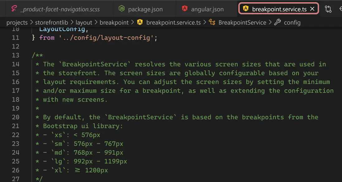 在文件 projects\storefrontlib\layout\config\default-layout.config.ts 裏,定義了各個屏幕尺寸所對應的 breakpoint: