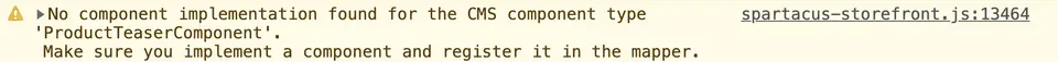 創建一個基本的 Web 內容管理系統 (WCMS) 結構來複制您當前的店面並啓動您的 Spartacus 應用程序。 在 Chrome 開發者工具中打開您的控制枱選項卡,您將看到每個沒有相應 Angular 組件的 CMS 組件的警告,也將顯示可用 CMS 插槽的警告。