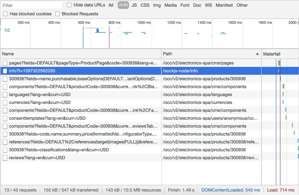 最後,您可以在 Chrome 開發人員工具的幫助下分析產品詳細信息頁面的示例調用,以瞭解所有內容是如何組合在一起的。使用網絡選項卡查看 Spartacus 生成的請求。