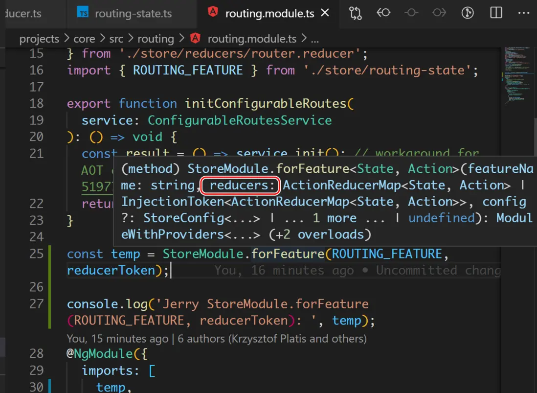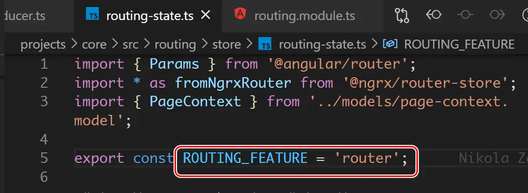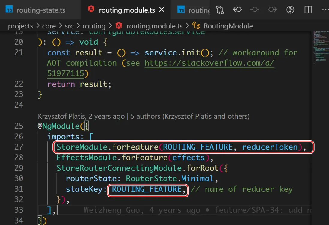 (3) 在 routing.module.ts 裏,作為 StoreModule.forFeature 和 StoreRouterConnectingModule 的輸入參數。