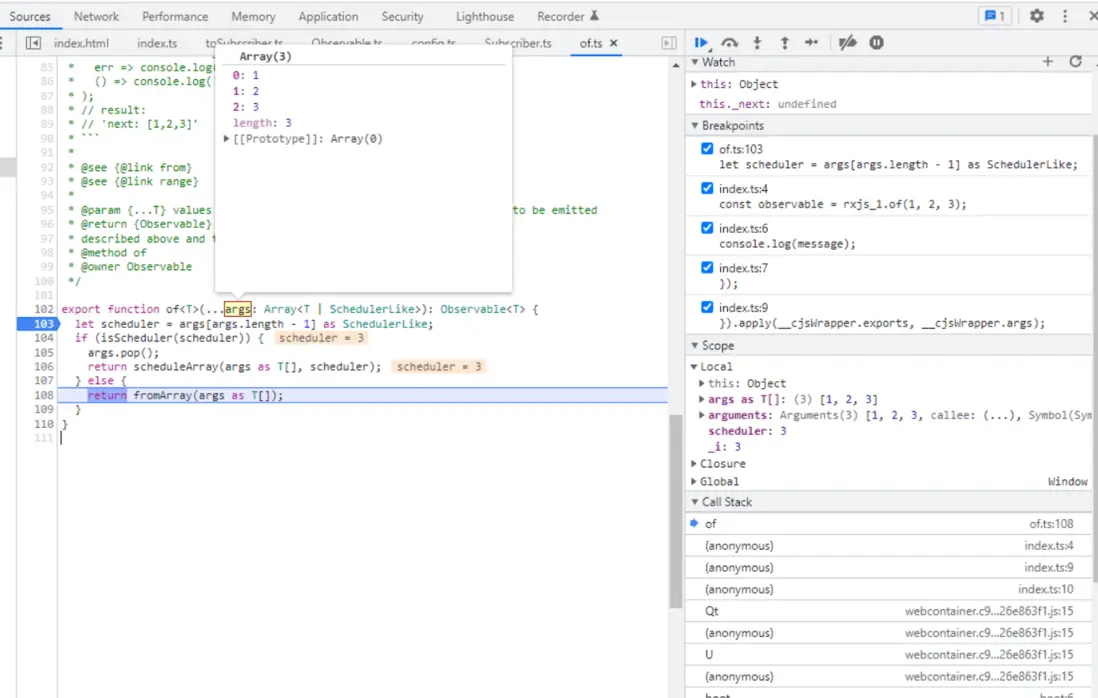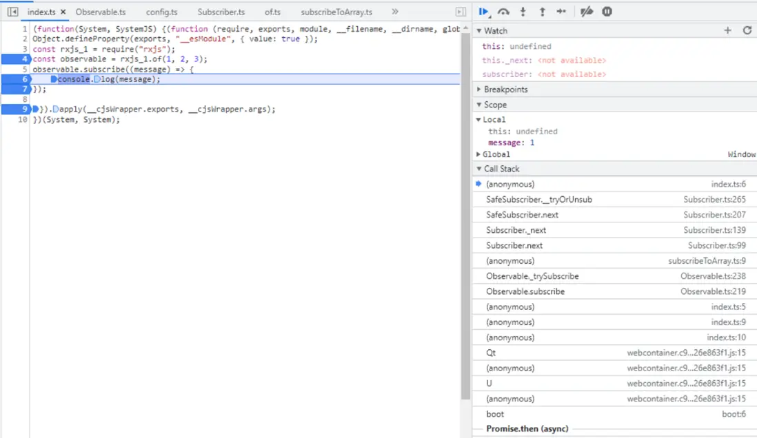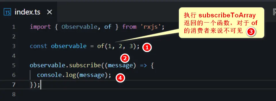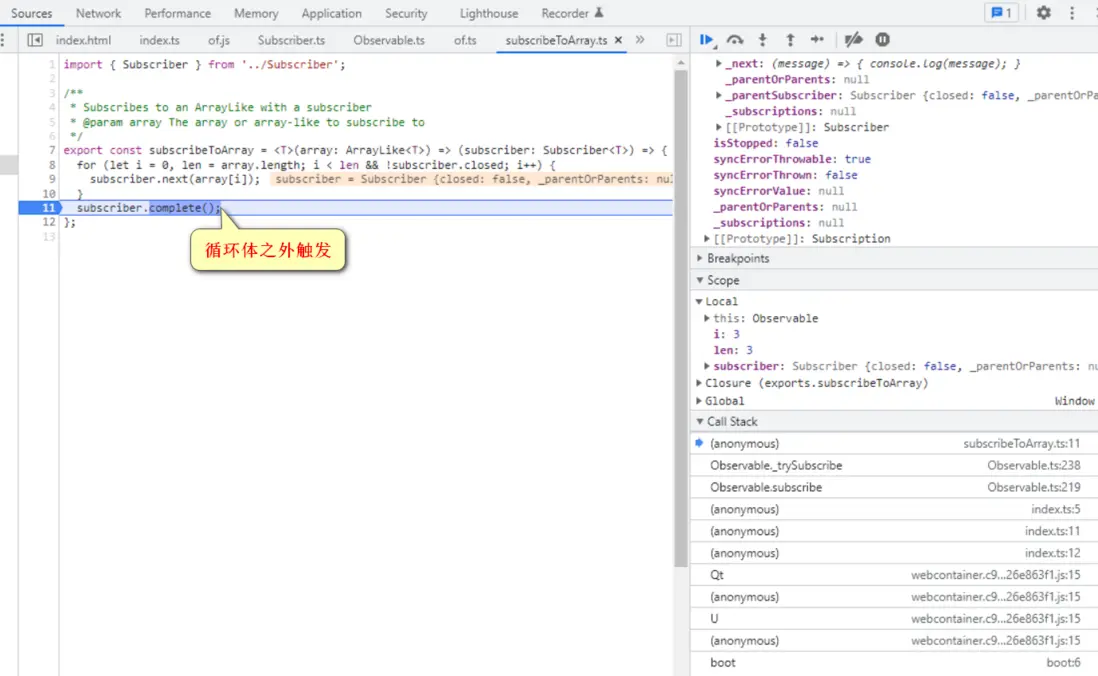 注意,上圖第 8 行的 for 循環,顯然在 of 函數調用裏不會執行,而是 of 返回的 Observable 被 subscribe 時才執行。subscribeToArray 的邏輯就是,一個簡單的 for 循環,循環體內依次調用 subscriber 的 next 方法,最後調用 complete 方法。
