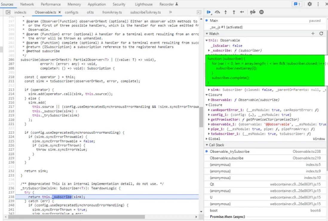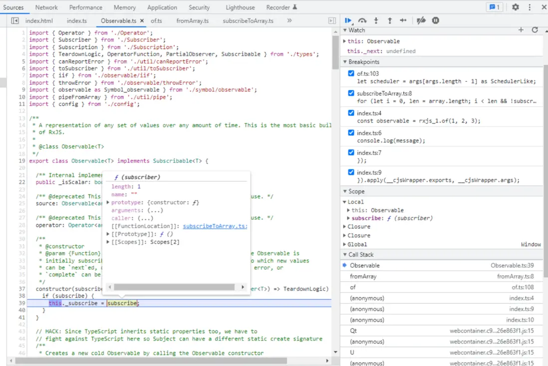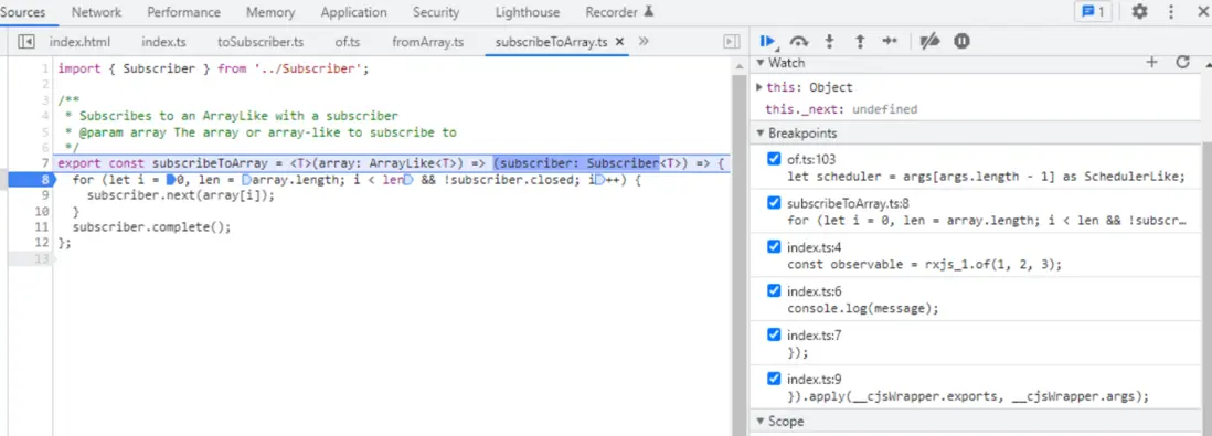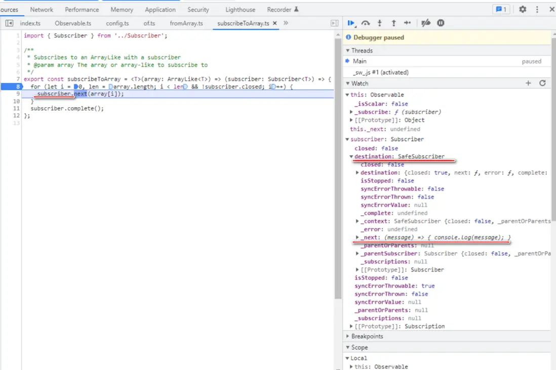 of Observable 實例的 _subscribe 方法,指向的就是剛剛 subscribeToArray 返回的函數: