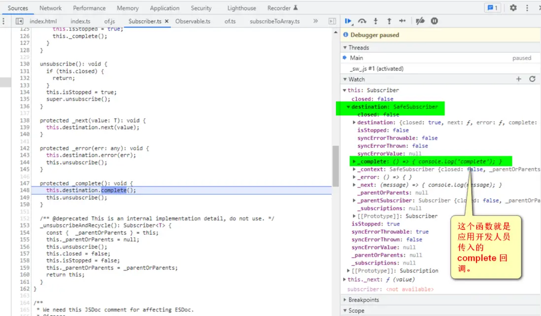 subscriber 並不是應用開發人員創建的,而是 rxjs 框架內部維護和使用的。subscriber 有一個屬性 destination,指向 Safesubscriber,這個 safesubscriber 的 _next 屬性,指向的就是應用開發人員維護的回調函數。