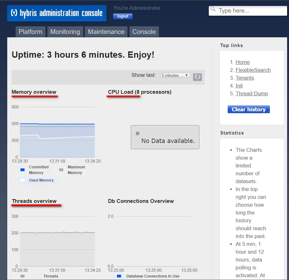 It is known that we can use Hybris Administration Console to monitor the runtime behavior of installed Hybris Commerce instance such as Memory, CPU load and thread overview.