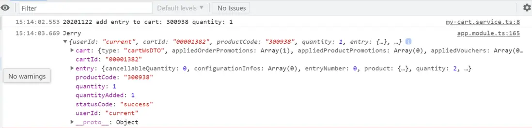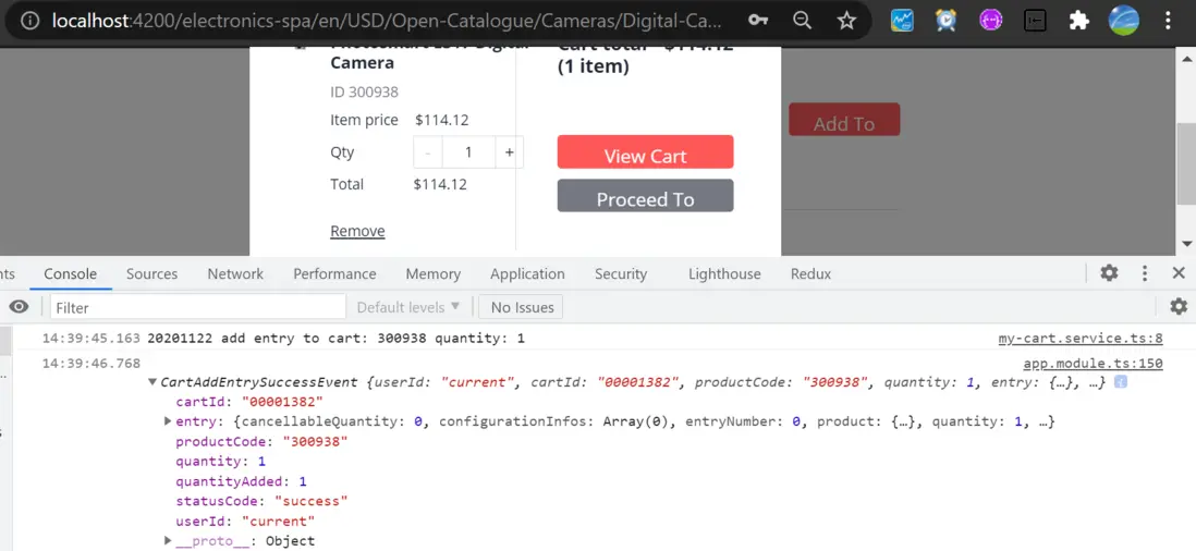運行時,我一旦將某個產品加到購物車裏,就會觸發上面 app module 裏註冊的匿名函數的 console.log, 打印出 CartAddEntrySuccessEvent 實例的值。