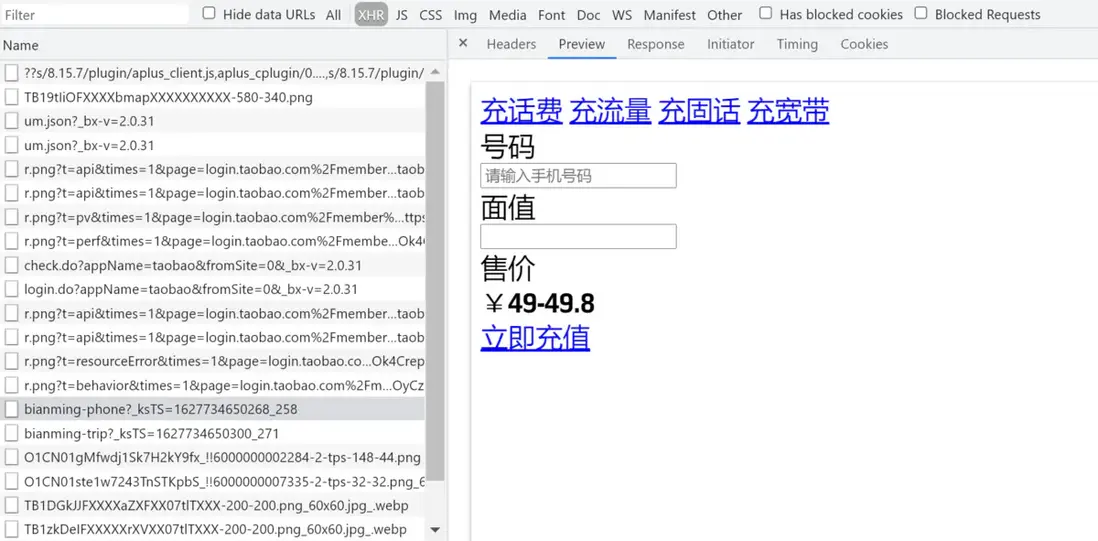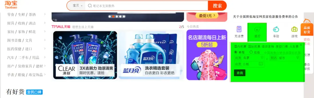 此外,我們在這個電商網站首頁右邊區域,能看到快速充值話費的面板,如下圖綠色高亮區域所示: