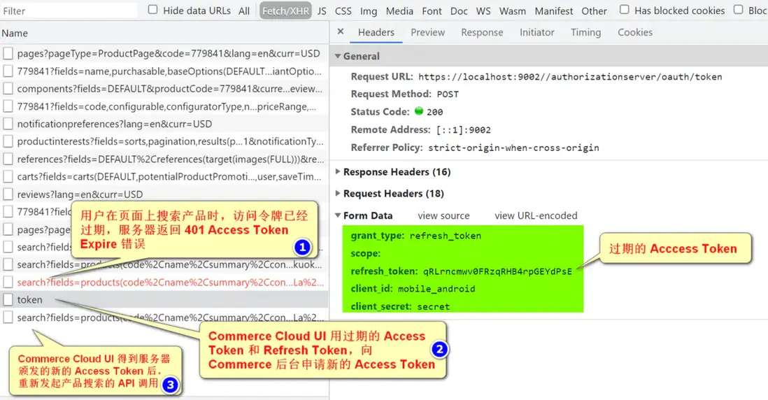顯然這種偏技術的錯誤消息不應該顯示給用户,幸運的是我們還有刷新令牌。此時,SAP Commerce Cloud UI 會將過期的訪問令牌,連同刷新令牌一齊發送給 Commerce 後台,申請一個新的訪問令牌: