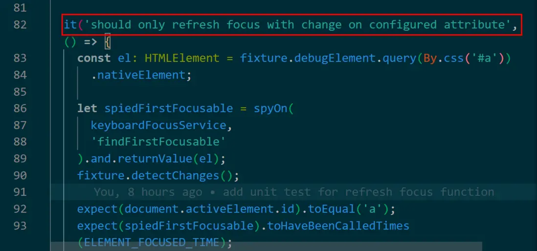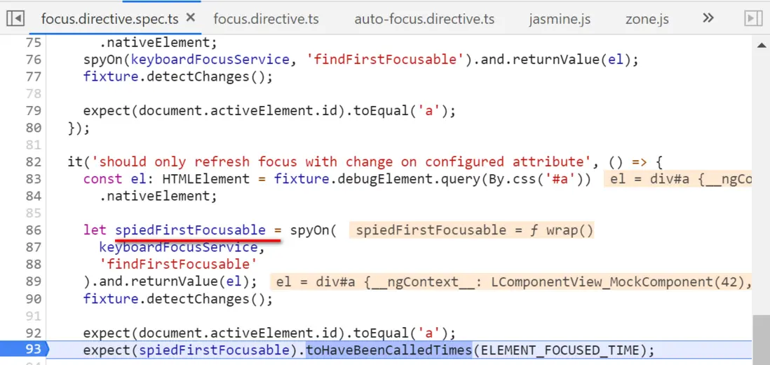 spiedFirstFocusable是spyOn方法針對實例keyboardFocusService的findFirstFocusable方法進行監控後返回的句柄。藉助該句柄,我們可以使用toHaveBeenCalledTimes方法,得到其在單元測試過程中實際調用的次數。