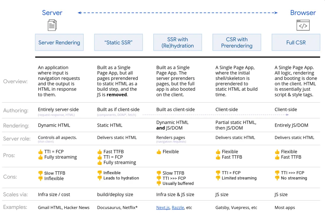 在決定渲染方法時,測量並瞭解您的瓶頸是什麼。 考慮靜態渲染或服務器渲染是否可以讓您完成 90% 的工作。 使用最少的 JS 來主要發佈 HTML 以獲得交互體驗是完全可以的。 這是一個方便的信息圖,顯示了服務器 - 客户端範圍: