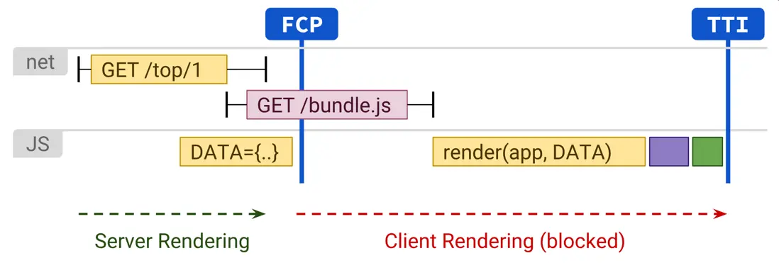 服務器渲染通常會產生快速的首次繪製 (FP) 和首次內容繪製 (FCP)。 在服務器上運行頁面邏輯和渲染可以避免向客户端發送大量 JavaScript,這有助於實現快速交互時間 (TTI)。 這是有道理的,因為通過服務器渲染,您實際上只是向用户的瀏覽器發送文本和鏈接。 這種方法可以很好地適用於各種設備和網絡條件,並開啓了有趣的瀏覽器優化,例如流式文檔解析。