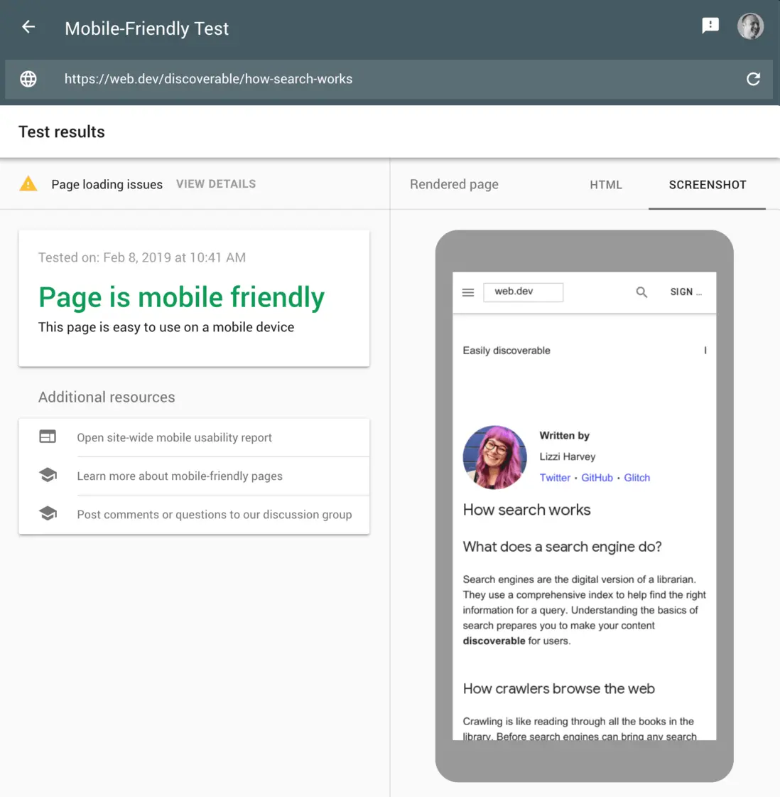如有疑問,Mobile Friendly 測試工具對於測試您選擇的方法是否符合您的期望非常有用。 它顯示了任何頁面在 Google 抓取工具中的顯示方式、找到的序列化 HTML 內容(在執行 JavaScript 之後)以及呈現期間遇到的任何錯誤的視覺預覽。
