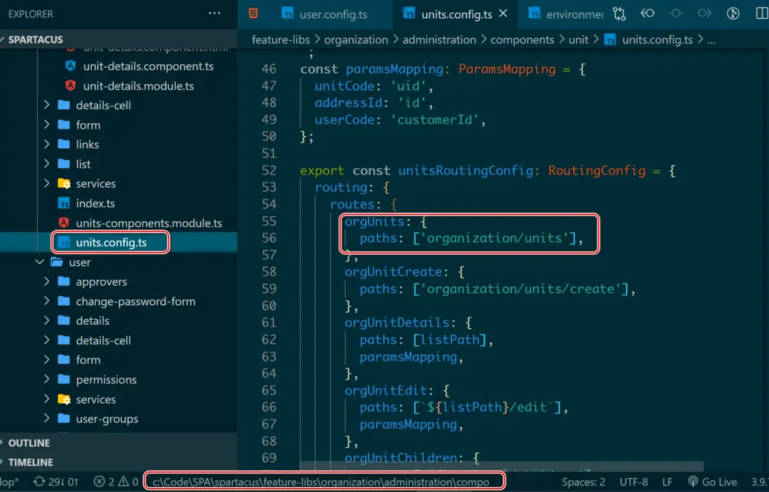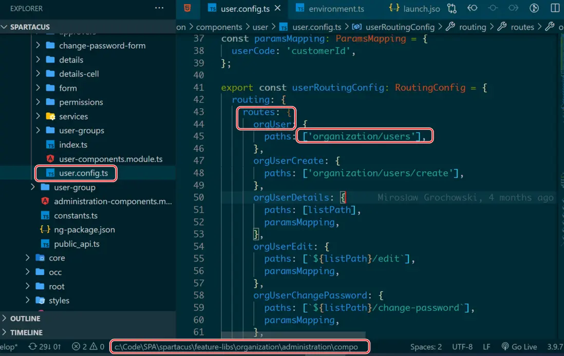 和 B2B User tile 相關的配置,都維護在文件 user.config.ts 裏, orgUser 的路徑為 organization/users:
