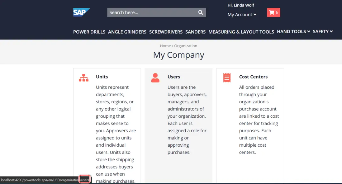 SAP Spartacus B2B 頁面類似 SAP Fiori Launchpad,共有 6 個 tile(磁貼),點擊某個磁貼,能跳轉到對應的列表頁面。