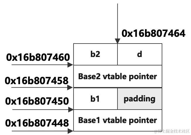所以,分析的結論就是子類對象的內存佈局是這樣的,首先是從Base1父類繼承來的虛函數表指針,佔用8字節,接着是繼承來的b1成員變量,加上填充的4字節共佔用了8字節,再接着是從父類Base2繼承來的虛函數表指針,佔用8字節,之後是繼承的b2成員變量,佔用4字節,子類自己的成員變量d緊跟着排列在後面,總共32字節。佈局示意圖如下: