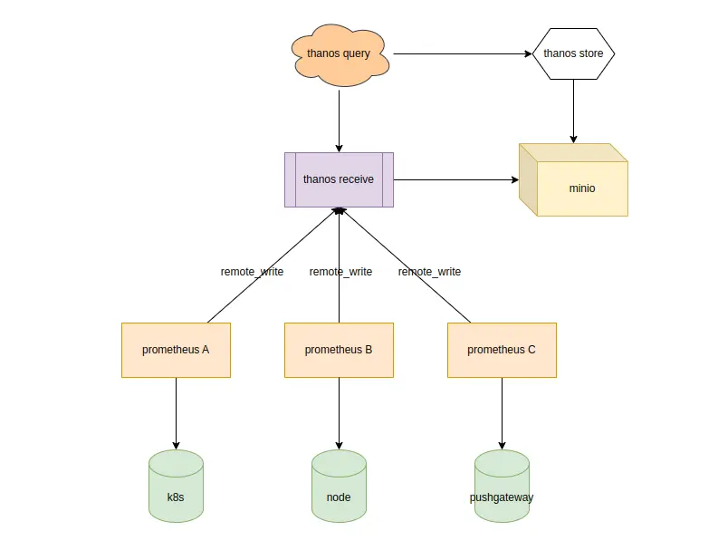 - receive:獨立部署,提供了數據寫入的api,prometheus通過這個api把數據推送到receive的對象存儲